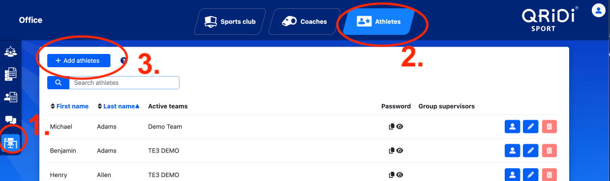 - The coach or another person in the club enters the names of the athletes and gives each of them their own login credentials, which Qridi Sport generates automatically. This is also a quick way, as you can bring all the team's athletes at once. If you also provide the athletes’ email addresses, you won’t need to distribute separate login credentials to them.