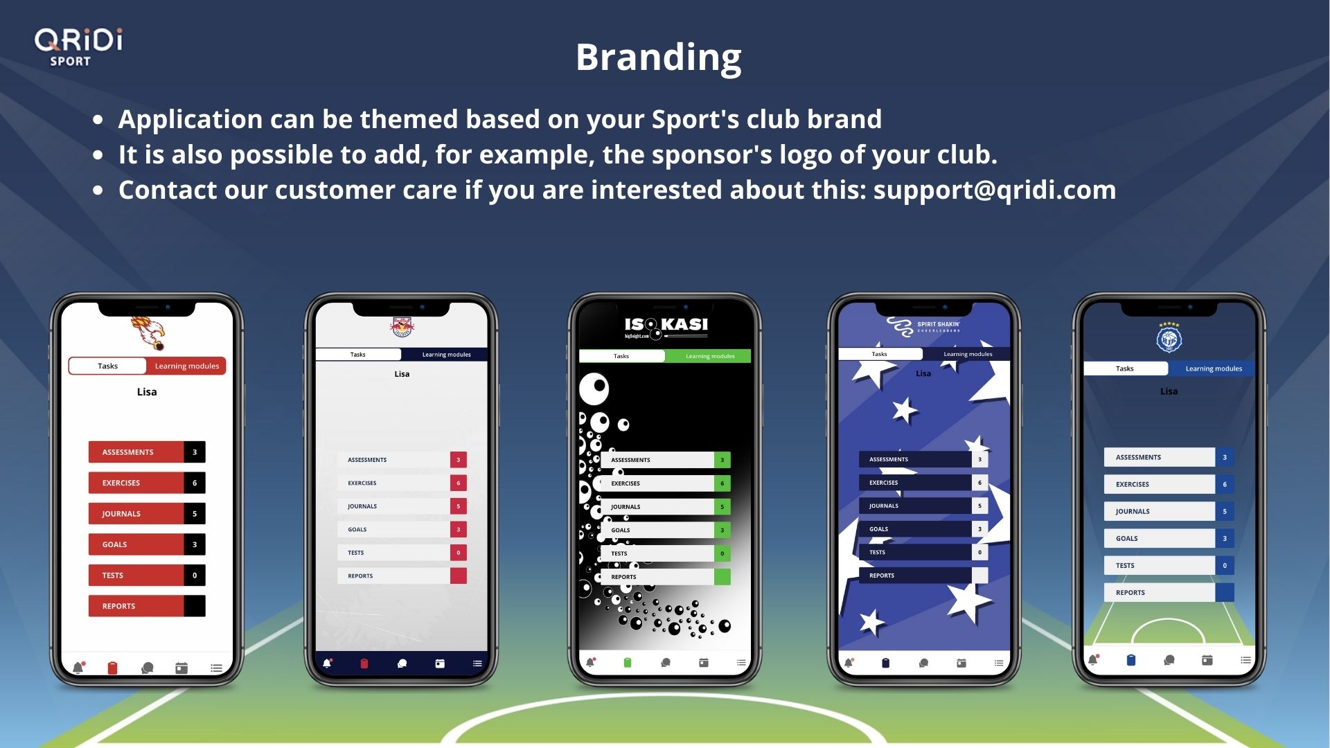 The apps can be themed with the club’s logos and colors. If you’re interested, please contact our customer support at support@qridi.fi.