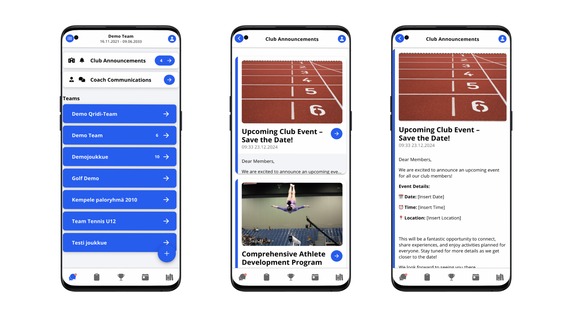 Announcements offer a visually appealing and effective way to share important information with the club members. Recipients can also read the announcements directly from their own apps, ensuring the information reaches everyone easily.