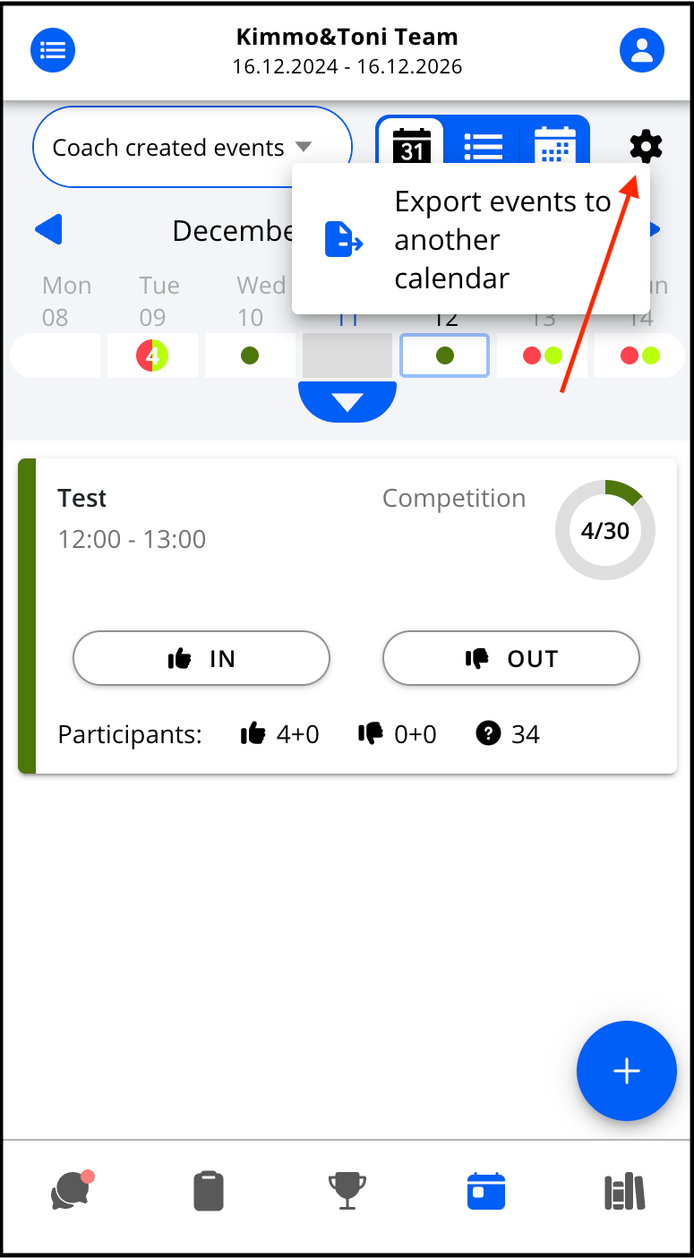 Kalenteri- ja tapahtumaominaisuuden avulla joukkueen arki integroituu yhdeksi kokonaisuudeksi. Kalenteriin lisätyillä tapahtumilla voidaan seurata tapahtumiin osallistumista, suunnitella harjoituksia ja hallita muita tapahtumiin liittyviä ominaisuuksia.