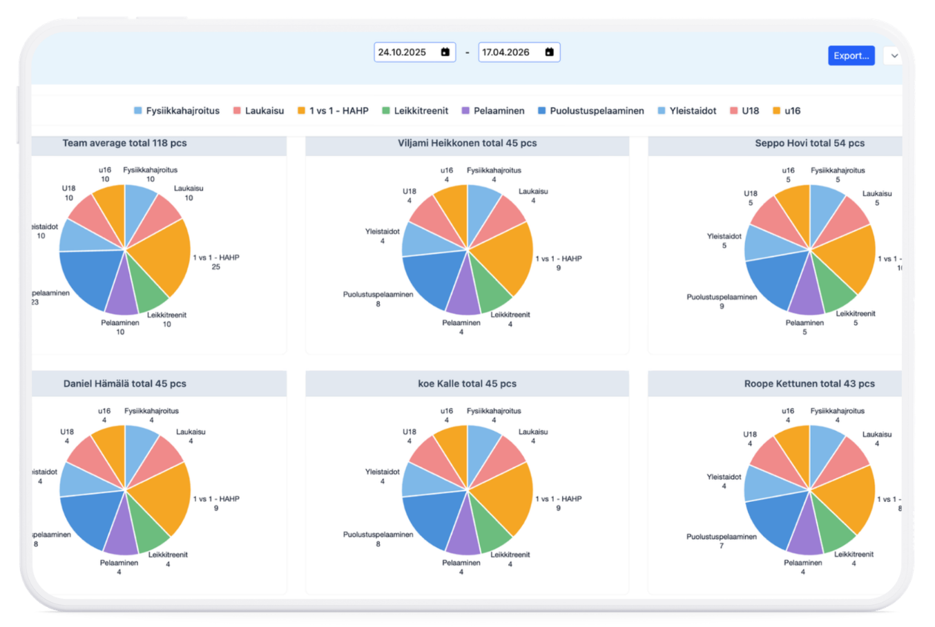 - Harjoittelun raportointi: joukkue- ja seuratasollla on harjoittelun analytiikka on nyt katsottavissa (ks. kuva alla). Raportoinnissa hyödynnetään harjoitepankin harjoitteiden tageja. Voit katsoa historiaa tai tulevaa joukkue- ja pelaajatasolla.